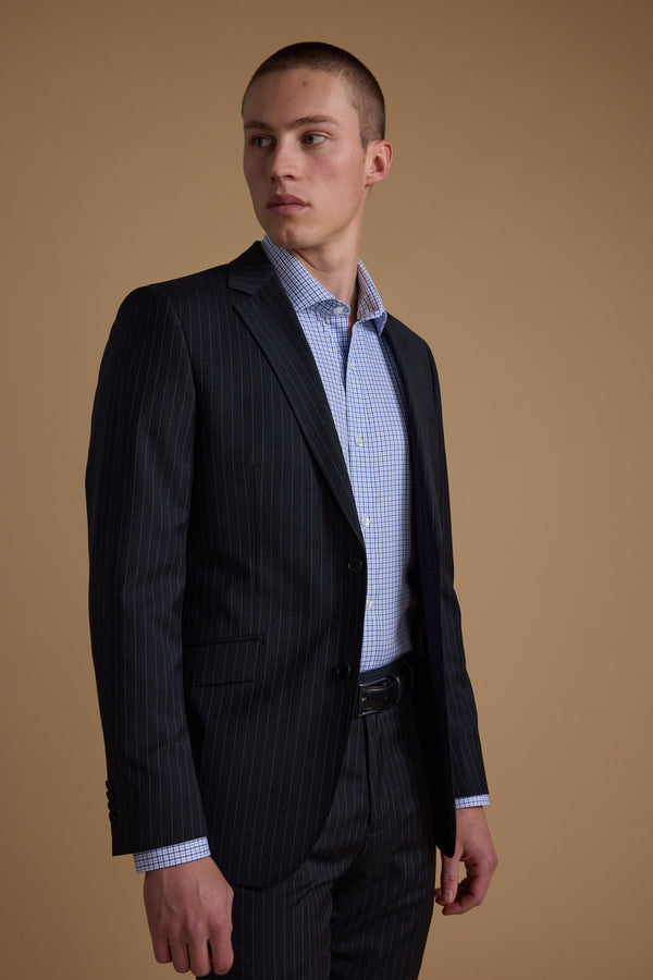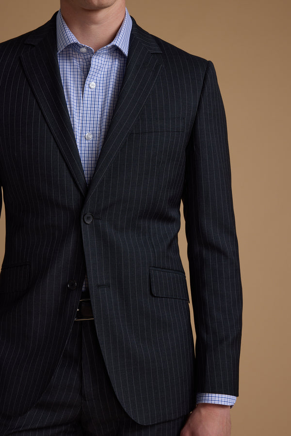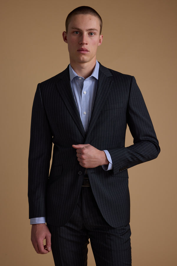 There’s nothing more timeless than a well-cut pinstripe suit — and the Ashbury Stripe Suit proves it. Cut from a rich charcoal cloth with a refined fine pinstripe throughout, it’s a go-to for everything from weddings to workdays to elevated evenings out. Tailored with a single-breasted construction, notched lapel, back vents for ease of movement, and fully lined for all-day comfort. Classic, confident, and always the right choice.