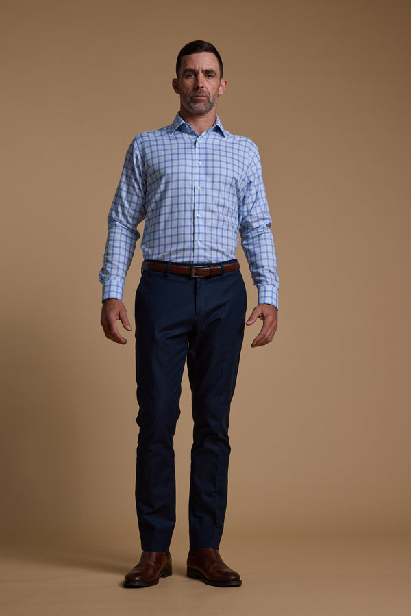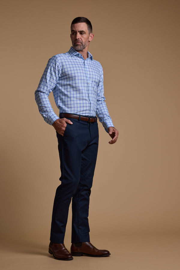 The Bayard Check Shirt is a dependable business essential, featuring a crisp check in versatile shades of blue. Designed in our classic fit, it offers a more relaxed fit and all-day comfort without sacrificing a smart appearance.