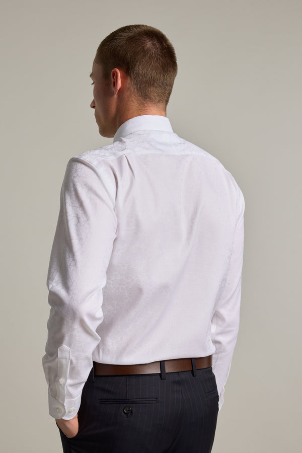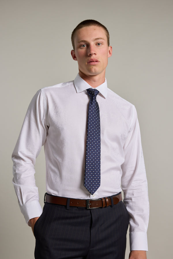 A fresh take on a classic. The Corran Paisley Business Shirt features a subtle paisley texture on crisp cotton, adding just the right amount of detail to a timeless staple. Tailored for a sharp fit and finished with button cuffs, it’s a refined choice for any occasion—clean, versatile, and effortlessly sophisticated.