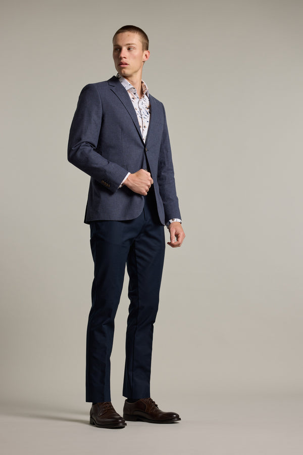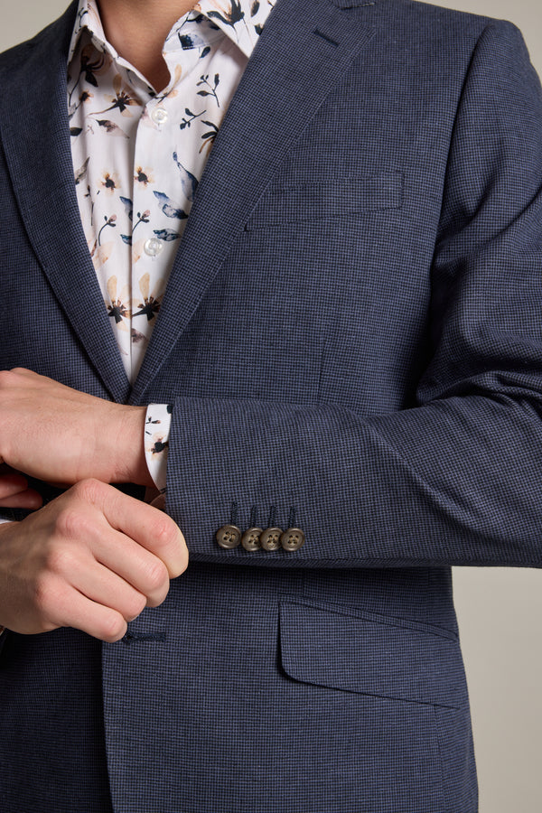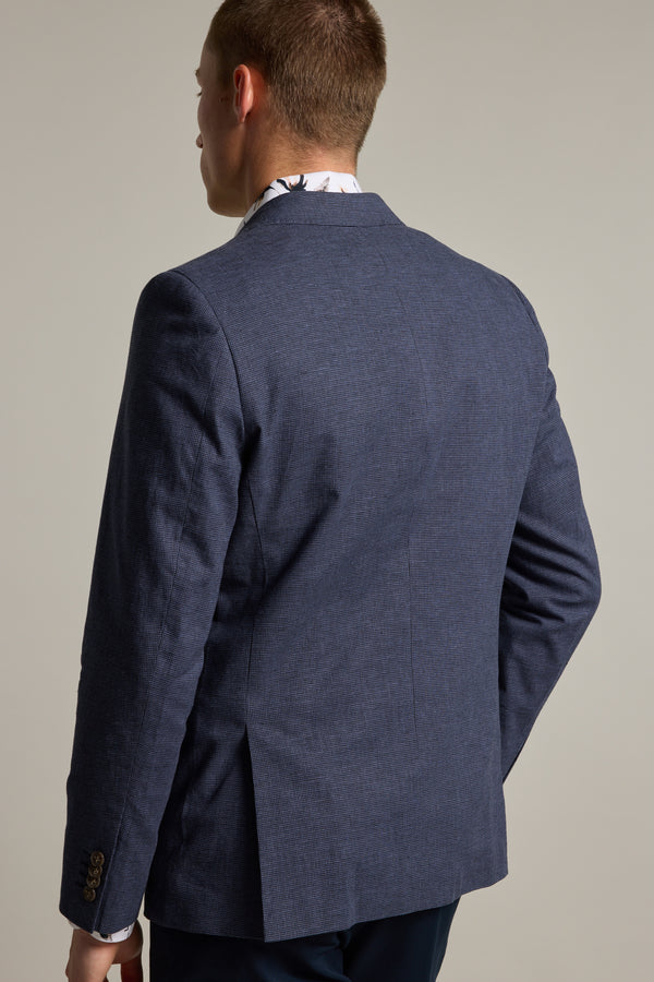 The Ellwood Houndstooth Blazer is a timeless staple you’ll keep coming back to. Crafted from a breathable cotton-linen blend, it features a subtle houndstooth pattern in understated navy tones—effortlessly blending classic style with modern versatility. Designed with a sleek single-breasted cut, peak lapel, and side cutaway flap pockets, it’s refined enough for any occasion. Whether dressed up or down, the Ellwood adds a polished touch to your wardrobe, season after season.