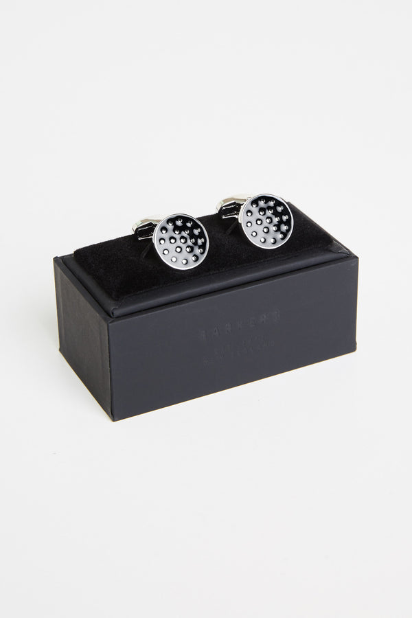 A circular cufflink with a black enameled finished with silver polka dots. The perfect finishing touch to any formal look, teamed with one of our Tribeca French Cuff Shirts.