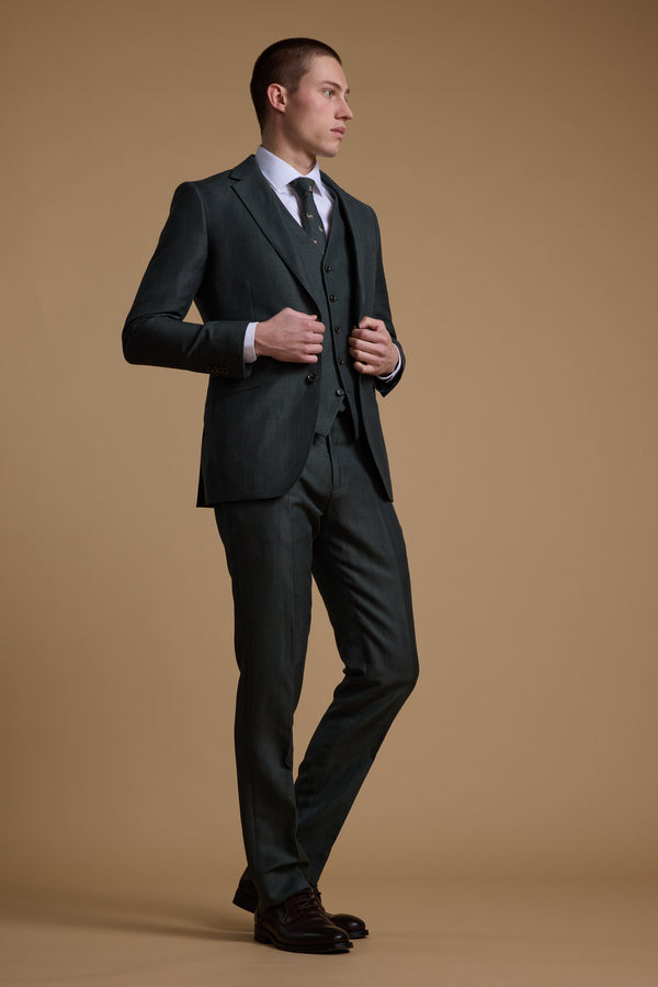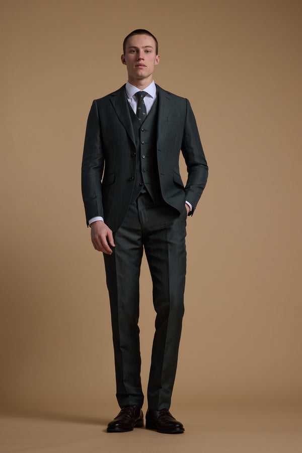 The Faulkner Trousers are cut from the same refined wool-linen blend, designed as a versatile match to the jacket or a standalone option for tailored dressing. Fully lined to the knee for all-day comfort, they’re finished with a clean flat front that creates a sharp, flattering silhouette. Pair with the matching jacket and waistcoat for a polished three-piece look, or style with a crisp shirt for an effortless take on smart summer event dressing. Composition: 53% Wool 47% Linen