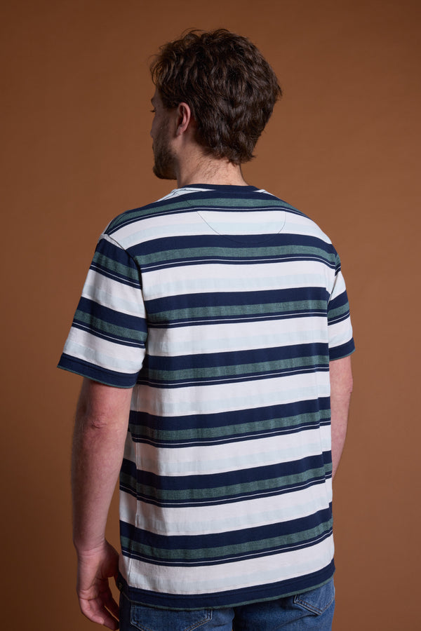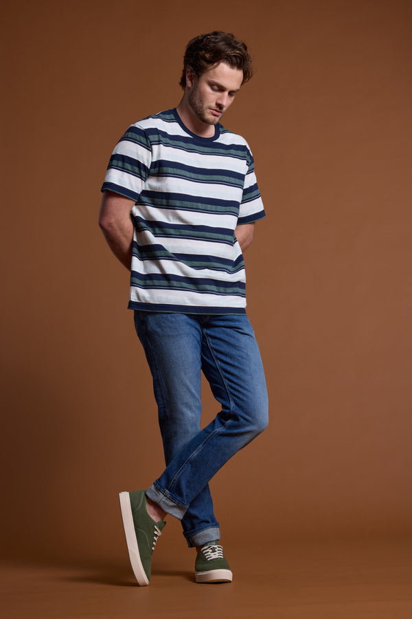 Nothing beats adding a fresh stripe tee into your daily rotation. Cut in our standard Barkers fit, the Fillmore Stripe Tee features multi-coloured horizontal stripes in blue and green tones with a herringbone pattern woven throughout the alternating design. We trust that this is the best fitting tee, striking the perfect balance of a boxy yet refined fit. Made from responsibly sourced organic cotton, this mid-weight tee feels as good as it looks.