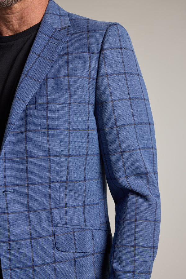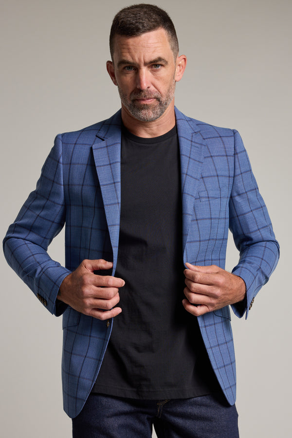 A modern classic in the making, the Flume Check Blazer is your new go-to. Designed in a refined blue check on a mid-blue base, it’s crafted from a premium wool blend and fully lined for all-day comfort. The single-breasted silhouette, peak lapel, and soft shoulder pads strike the perfect balance between structure and ease, while back side vents and cutaway flap pockets add a considered touch. Timeless yet contemporary, it’s a blazer that works as hard as you do.