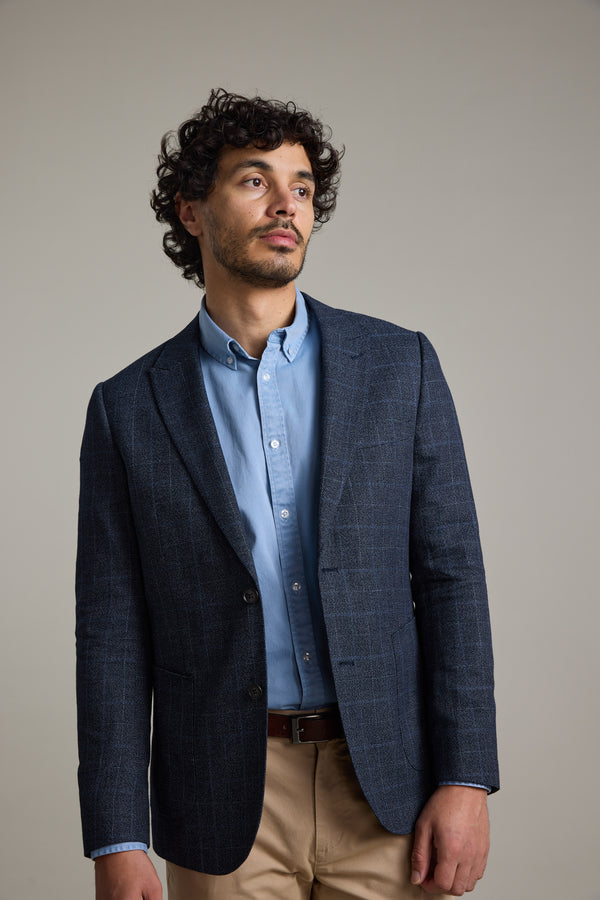 The Henson Blazer is your go-to for everyday workwear, refined yet effortless. Crafted in a sharp blue check, it’s single-breasted and fully lined with a contrast sateen lining. Thoughtful tailoring meets practical wearability, with a peak lapel, soft shoulder pads, front patch pockets, and back side vents that move as you do. Timeless, versatile, and made to carry you through the working day with ease.
