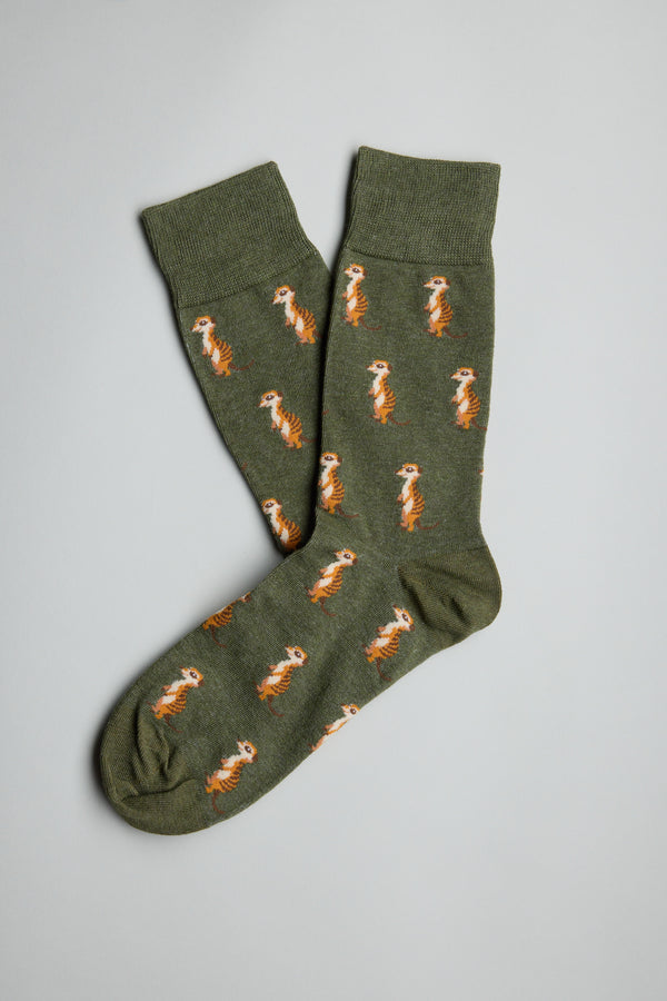 A conversation starter from the ground up. The Meerkat Socks balance everyday sophistication with a dash of charm, featuring an all-over meerkat motif set against a rich, versatile green base. Crafted in a premium cotton blend with a touch of stretch, they’re built for all-day comfort and a perfect fit.
