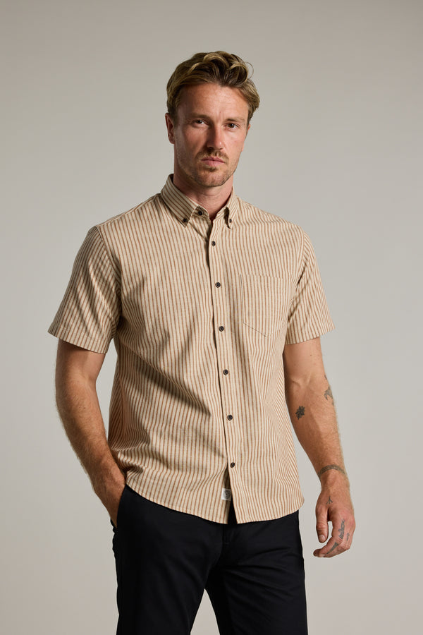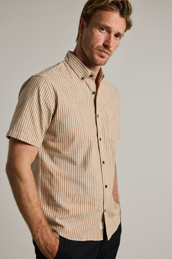 The Jordyn Stripe Shirt gives the classic short sleeve an elevated edge. Crafted from 100% responsibly sourced cotton, it’s lightweight, breathable, and perfect for warmer days. Designed in our signature regular fit, it features tonal vertical stripes for a refined yet relaxed vibe. Details like the exposed button-down collar, side shoulder pleats, and a triangle patch pocket bring a modern twist to timeless tailoring. Cool, comfortable, and consciously made—the Jordyn Stripe Shirt is your summer essential done right.