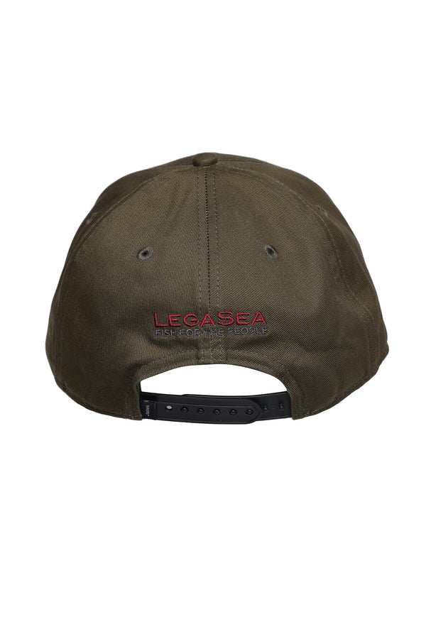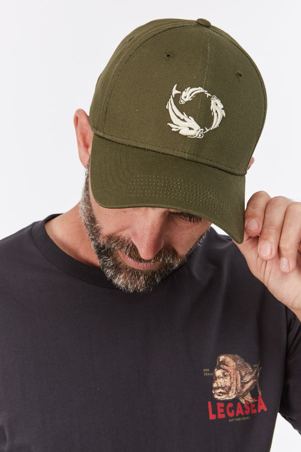The Legasea Logo Cap is a classic khaki panel cap with a circular white fish embroidered design. Finished with an adjustable snap back closure and Legasea embroidered branding at back.