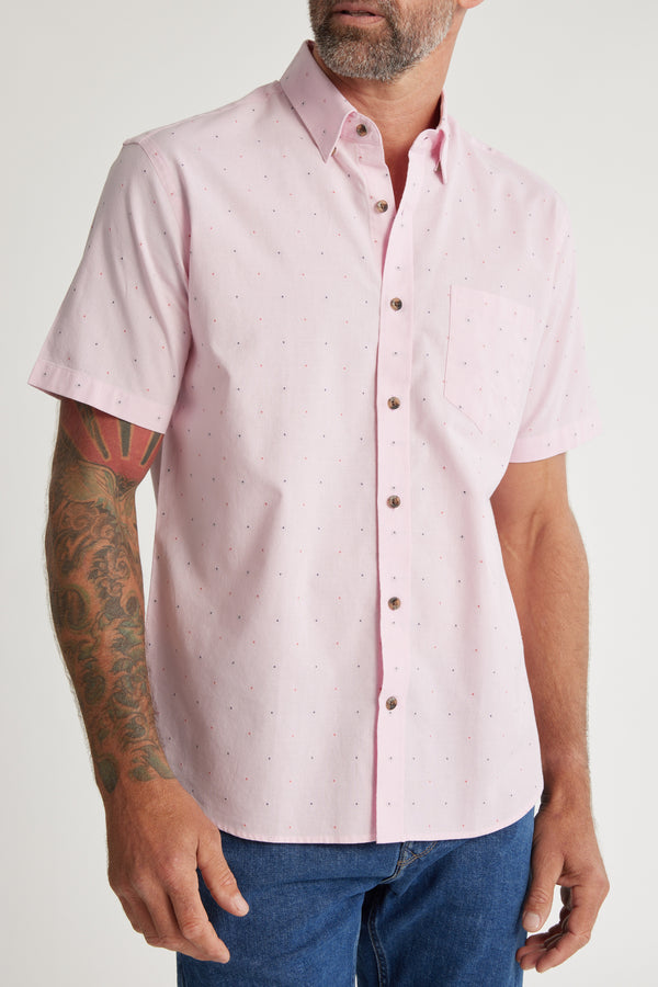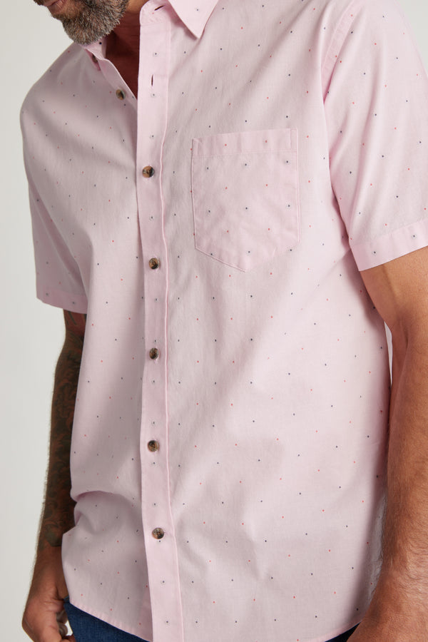 Spruce up your summer wardrobe with the Leslie Emb Shirt. Cut in a tailored fit, crafted of responsibly sourced cotton in a super soft wash, the Leslie features a subtle pindot embroidery design. Featuring a concealed button down collar, chest pocket, standard yoke, with a box pleat hanger loop, it's just the pop of colour you've been needing. Long lunches galore? The Leslie has got you covered, simply pair with chino shorts and a sleek sneaker and your good to go.