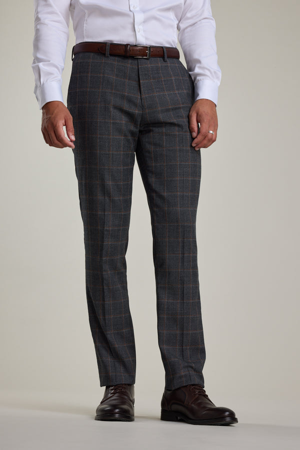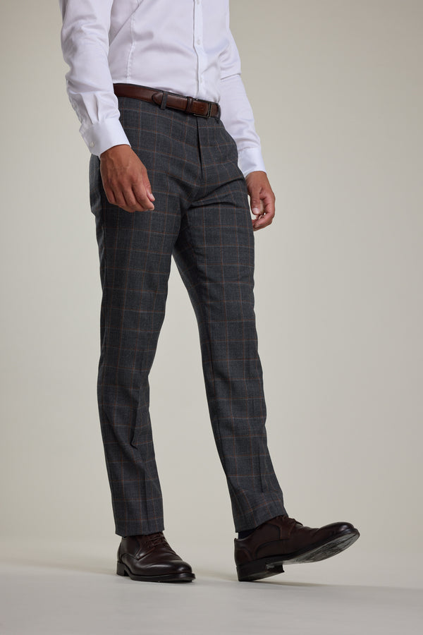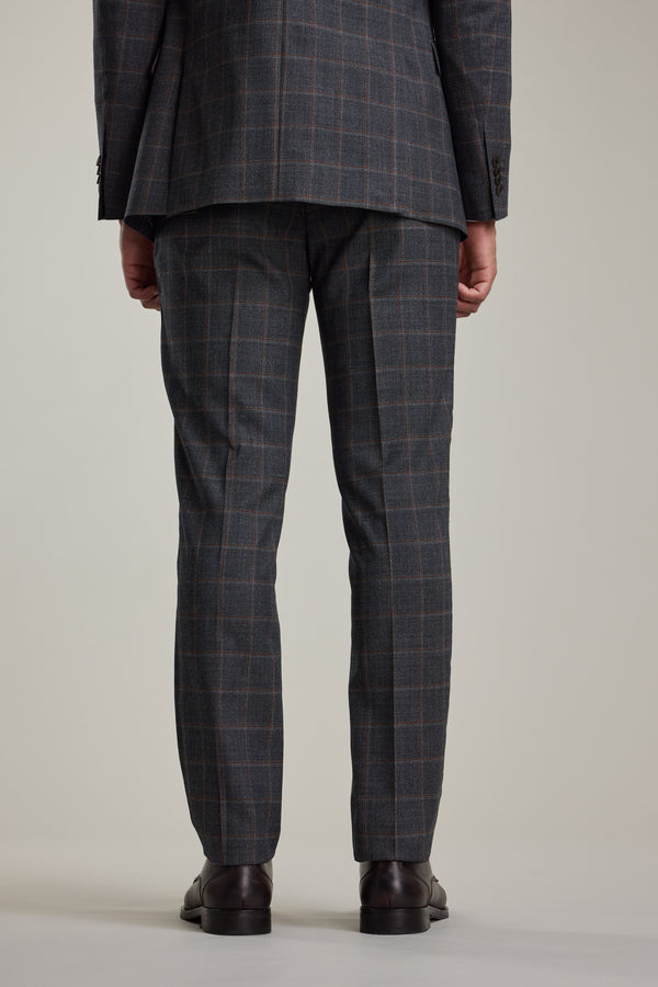 The Lewood Check Suit Trouser delivers a refined take on heritage tailoring. Crafted from 100% merino wool, it features a bold large-scale check in rust and grey, grounded by a rich charcoal base. The silhouette is a classic straight leg with a single pleat front. Fully lined to the knee for comfortable wearing and designed with a flat front for a flattering finish. Complete the look with the matching suit jacket for modern tailoring with character.
