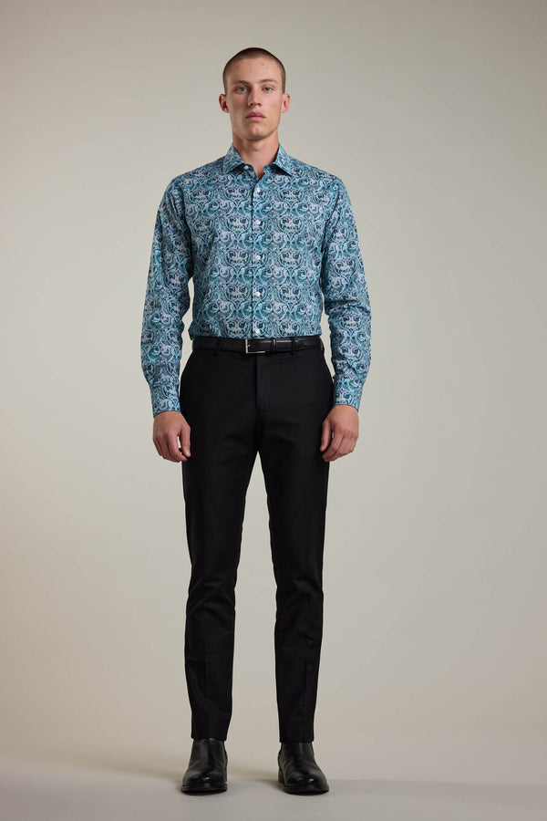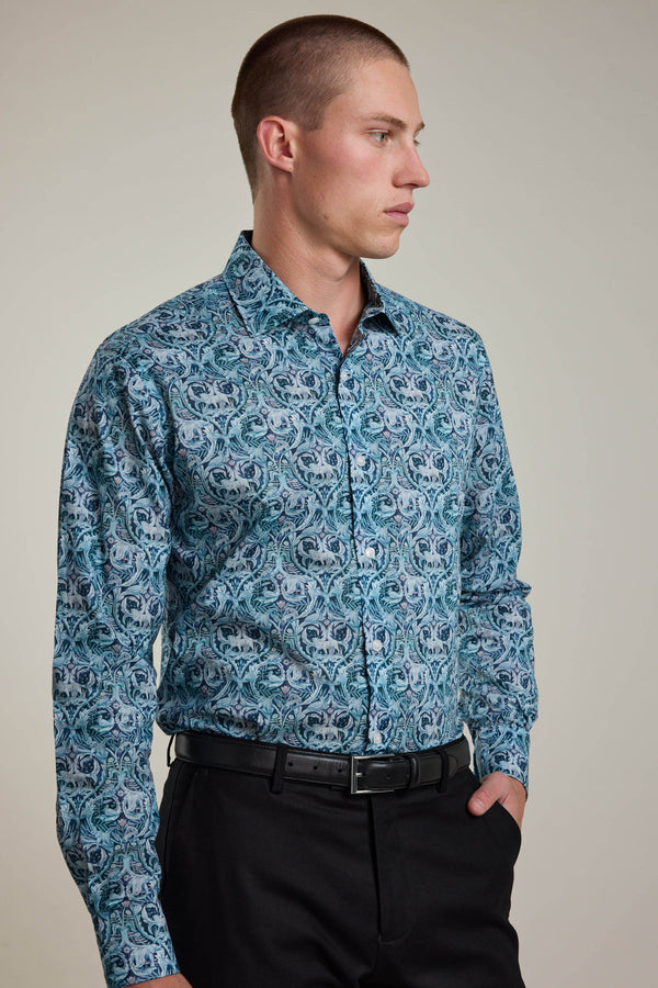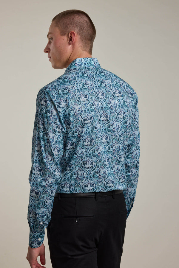 The Liberty Valerie Shirt is a wild, yet refined statement. Covered in varying shades of blue, its intricate hand-drawn animals reveal themselves upon closer inspection, adding a touch of artistry to the design. Crafted from ultra-soft, lightweight Tana Lawn cotton, it’s as breathable as it is beautiful—designed for those who appreciate the finer details.