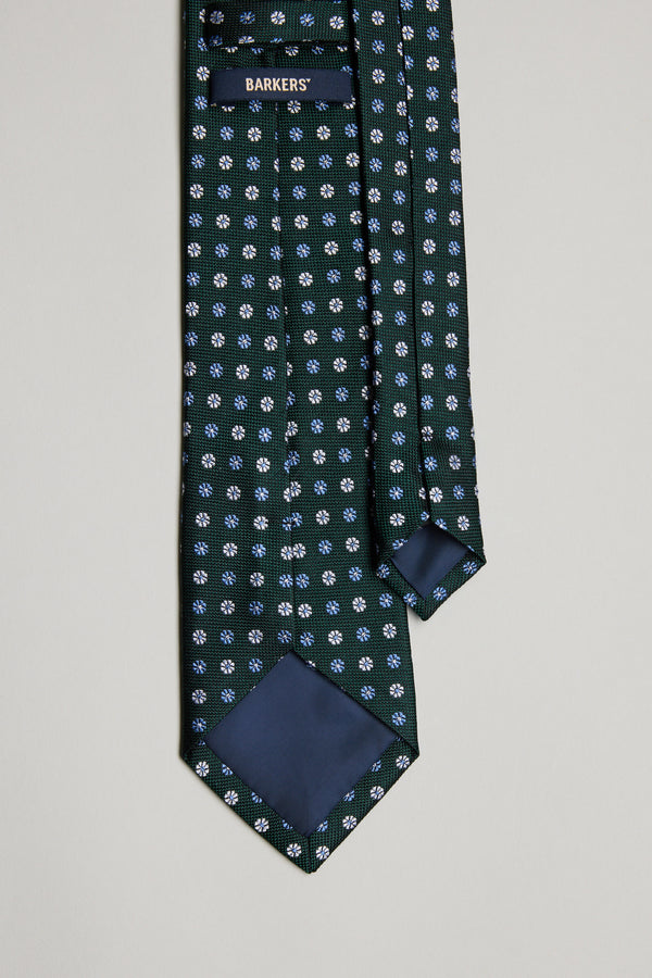 Elevate your ensemble with this season’s range of exceptionally crafted silk ties. The perfect pairing for your occasional wear or 9-5 business attire. Discover jacquard prints, stripes, pastel tones and intricate prints. The Lilia Tie features a floral print in yellow and blue tones across a deep green backgorund.