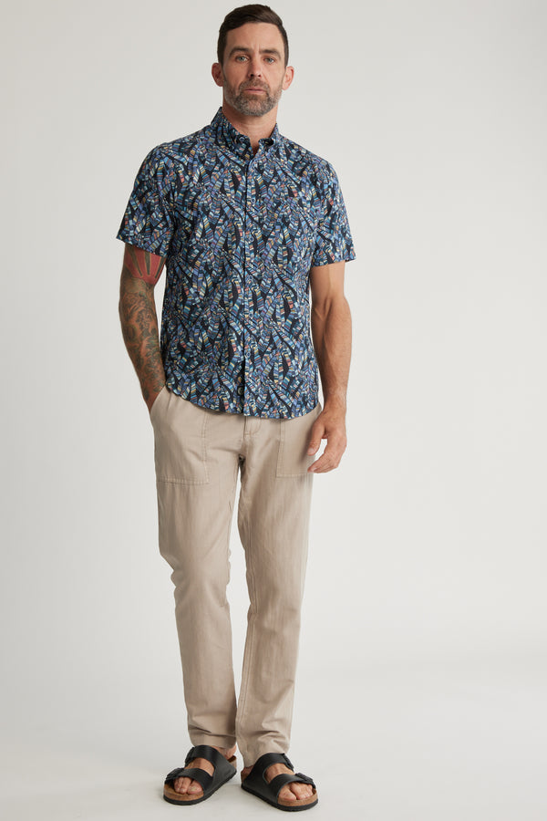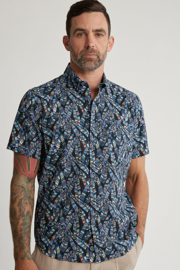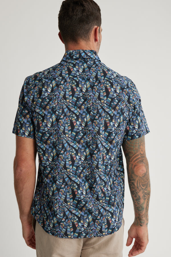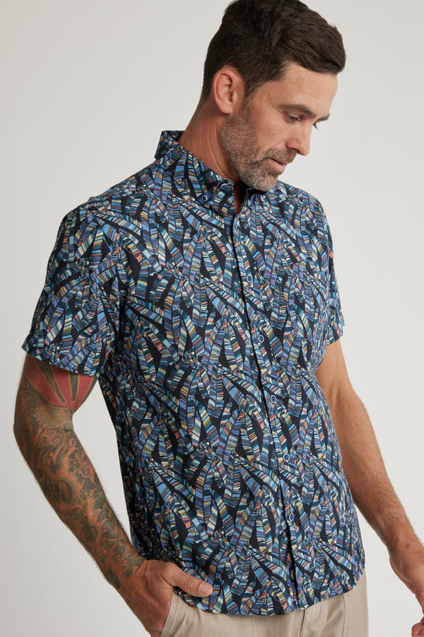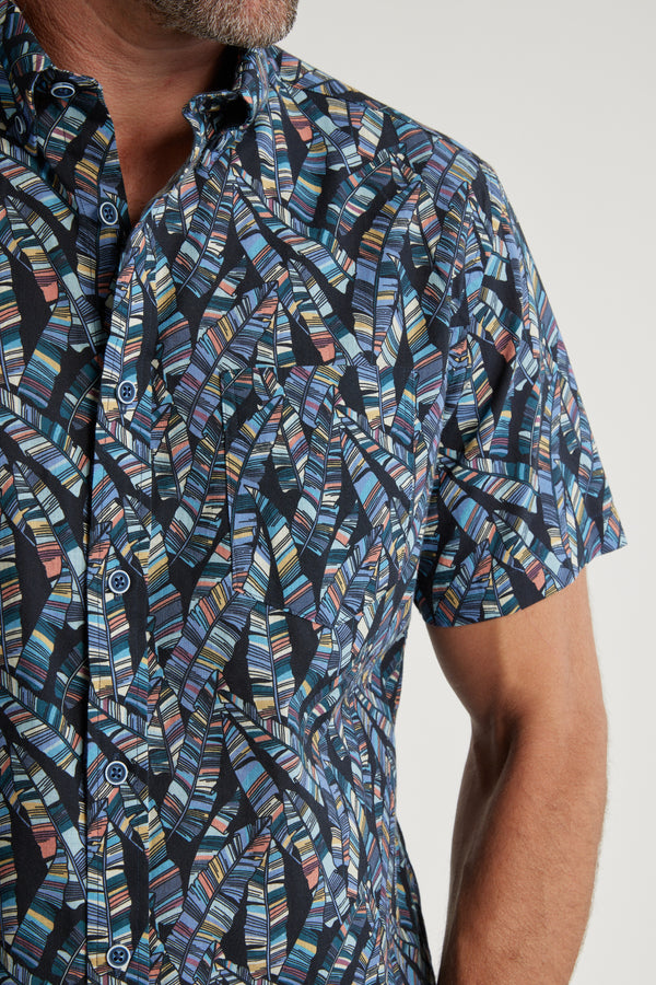 Finished in soft linen-like woven texture with a leaf all-over print, the Longleaf Print Shirt is a bold update to your shirt rotation. On a deep blue base, complemented with purples and various blue hues, this short sleeve shirt is super lightweight and breathable, perfect for the warmer weather. Pair with pants and sandals for a casual but smart fit.