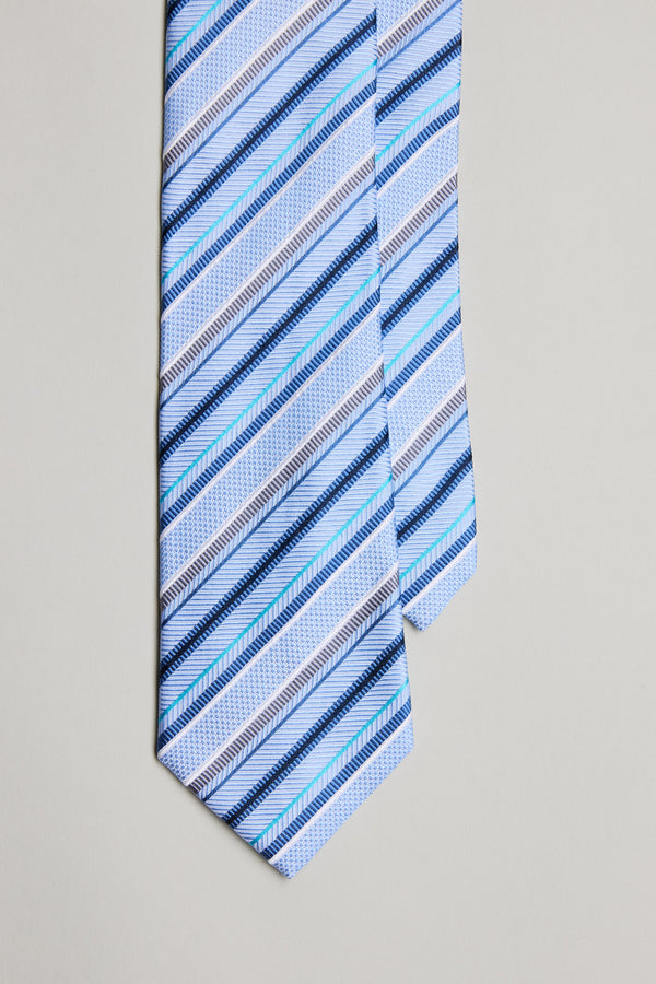 Elevate your ensemble with this season’s range of exceptionally crafted silk ties. The perfect pairing for your occasional wear or 9-5 business attire. Discover jacquard prints, stripes, pastel tones and intricate prints. The Maeve Stripe Tie has a light blue base with contrasting grey, blue and aqua diagonal stripes.