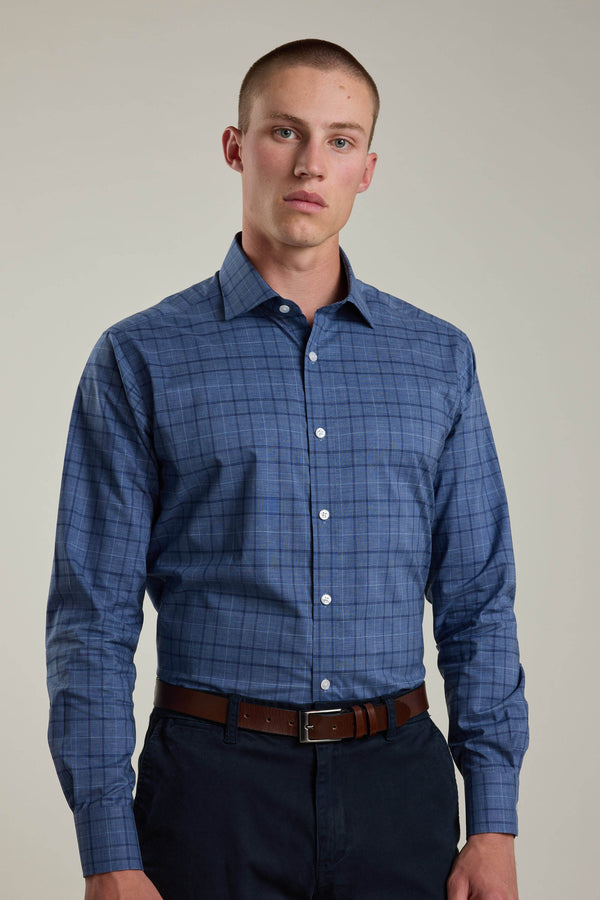 The Marr Check Business Shirt is crafted from responsibly sourced cotton and finished with our crease-resistant treatment — keeping you sharp and comfortable from morning meetings to after-hours. Designed in our tailored fit, it delivers a slim, modern silhouette without compromising ease of movement. Featuring a check pattern in contrasting tones of blue, it brings a refined edge to any workday wardrobe.
