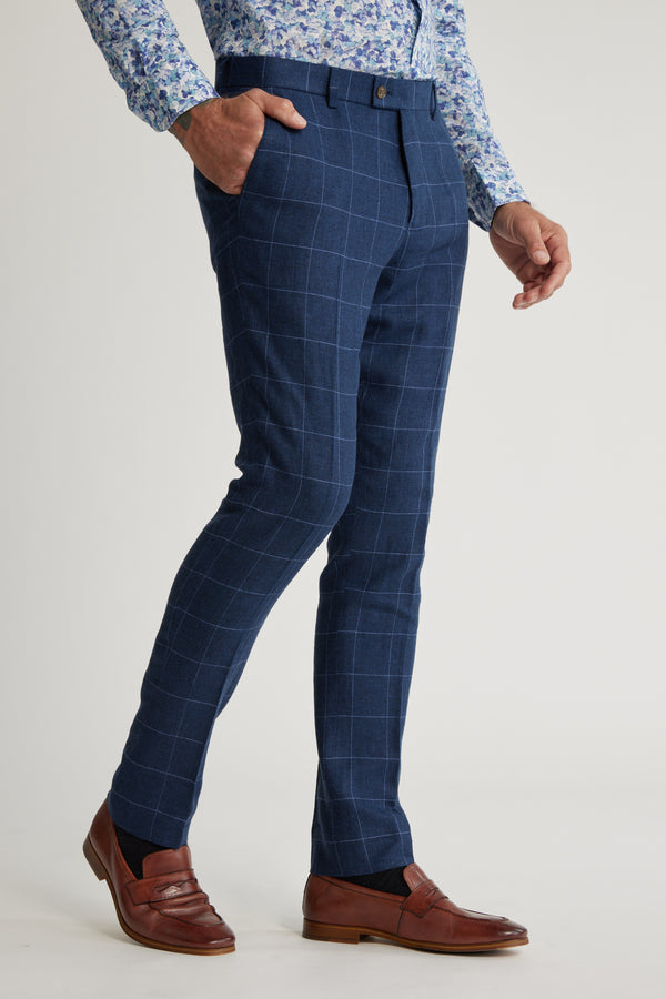 Composed of a linen blend, the Mayfield Linen Suit Trouser is your newest summer staple for the office, events or wherever you fancy. Fully lined with recycled polyester and viscose, these trousers compliment a navy blue check print. Also available is a matching blazer and waistcoat to make for a full suit set. Wear these from day to night, from work in the full suit set, to a night out with a shirt to dress it down.