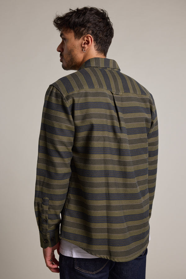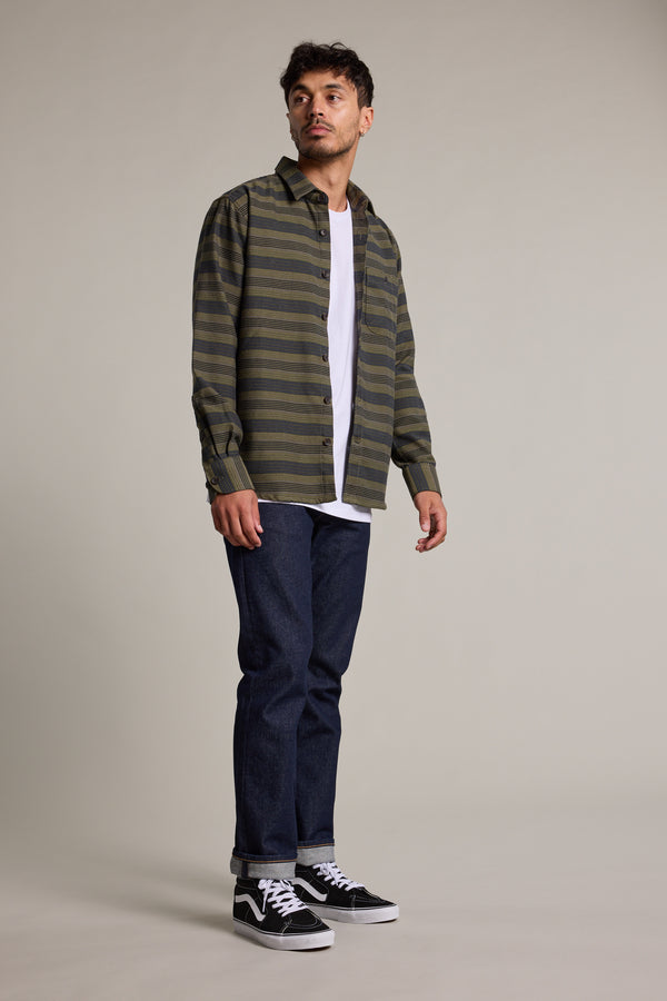 The Mossock Stripe Overshirt is crafted from durable twill cotton, boasting subtle forest stripes throughout. Its versatile weight makes it ideal for any season; simply pair it with jeans and a plain tee for effortless style.