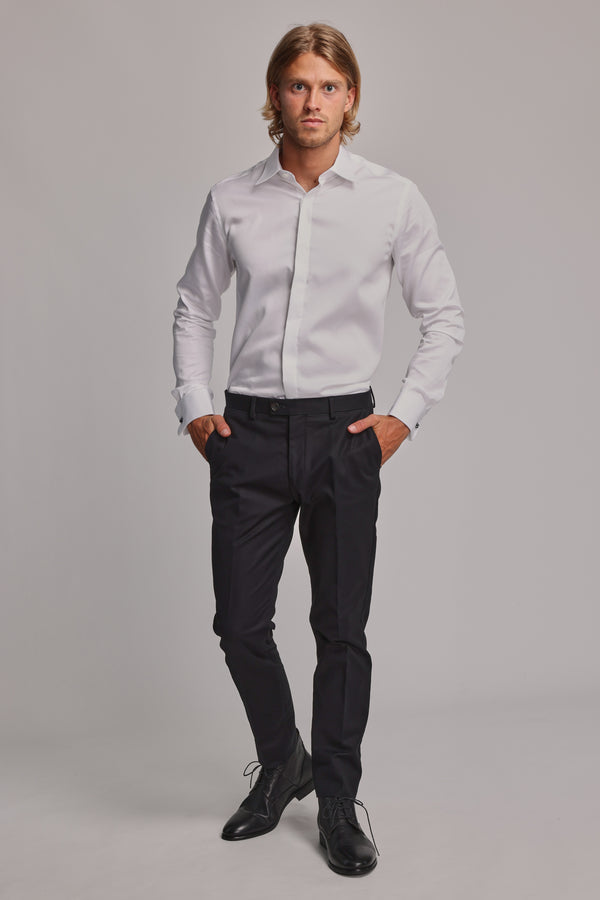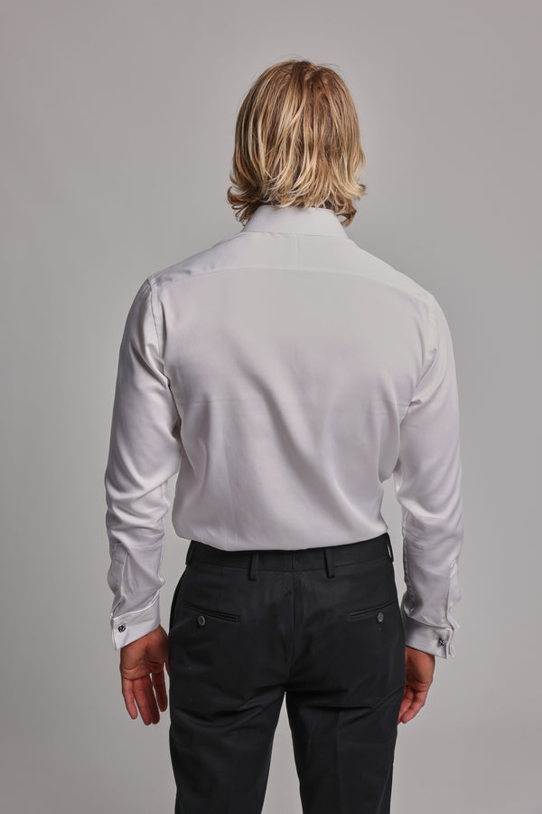 The Nelson White Shirt is an essential piece for the modern wardrobe. A tailored fit made from 100% cotton in a crisp white poplin finish along with elegant French cuffs make this dress shirt ideal for both professional and formal wear.