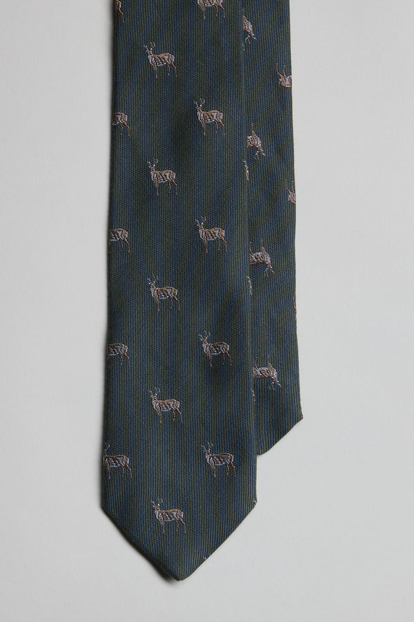 The Parisian Deer Tie is a dark khaki tie with deer embroidery. A refined way to bring depth and character to your look, it’s an effortless statement for formal occasions where style is in the details.