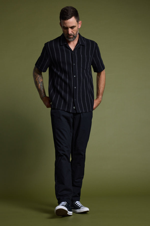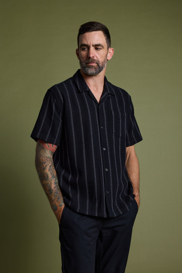 The Cuban collar shirt, a favourite of trendsetters and old-school Hollywood icons, is a timeless summer staple. Crafted from 100% responsibly sourced cotton, the Reed Shirt features white stripes against a dark background that add a striking contrast to your wardrobe. Whether buttoned up or worn open over a ribbed tank for a laid-back vibe, this versatile piece is made to keep you looking sharp all summer long.