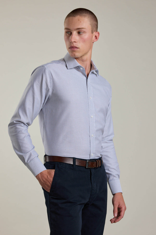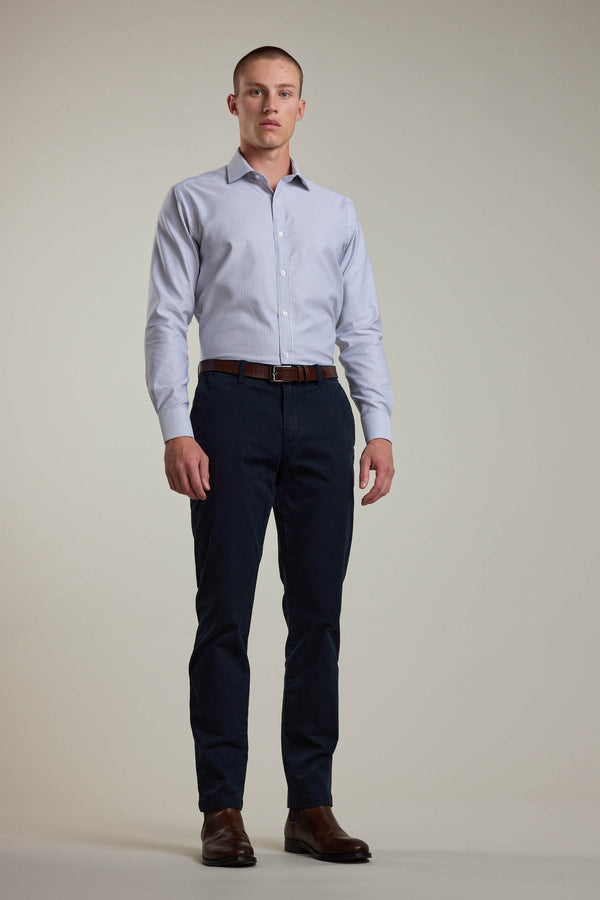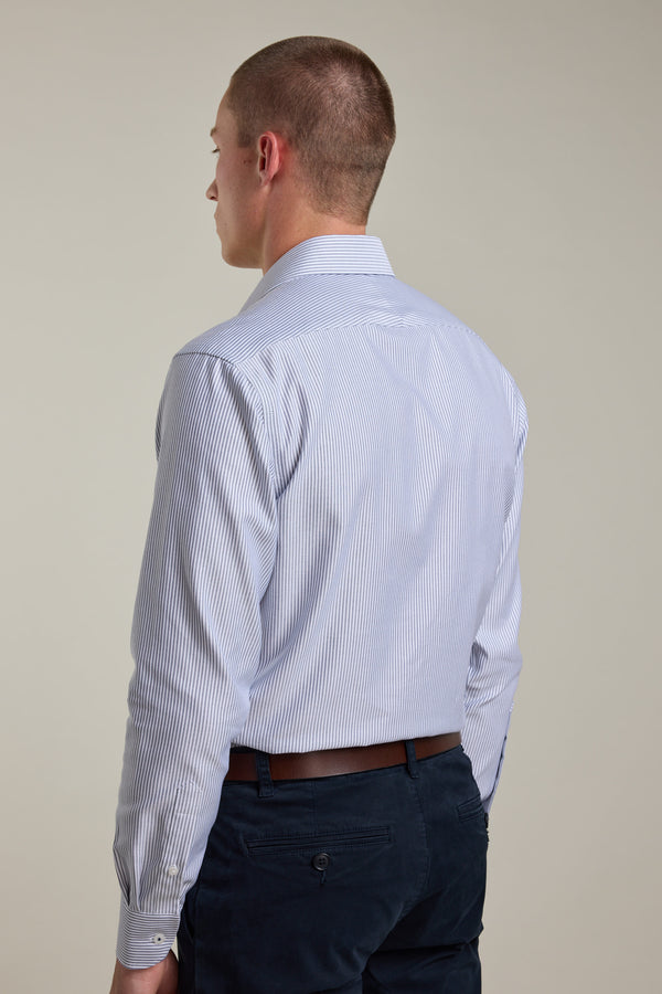 The Rhea Stripe Business Shirt is a foundation piece for a man’s wardrobe. Crafted from responsibly sourced cotton, it features a classic blue stripe that works effortlessly with any suit. Designed in our favoured tailored fit, it strikes the perfect balance between a modern slim fit that offers all day comfortable wearing.