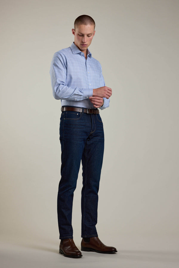 Built for everyday and beyond, the Tyson Check Business Shirt is a modern essential. Crafted from responsibly sourced cotton with a crease-resistant finish, it features a sharp white and blue check designed to elevate any suit or pair back seamlessly with dark denim for a more relaxed, business-casual look. Cut in our classic fit, it’s made for all-day comfort without compromising on style.