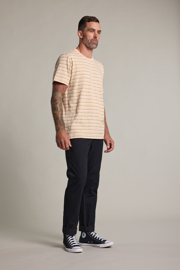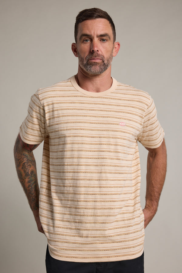 Expertly tailored in a timeless t-shirt silhouette, the Vermont Stripe Tee sets the standard for quality. Crafted from a heavily weighted organic cotton, it boasts a thicker ribbed neckline to maintain its shape and prevent stretching over time. Horizontal stripes and an embroidered Barkers motif on the chest add a touch of style. Available in two colourways this season, we truly believe this is the best cut tee.