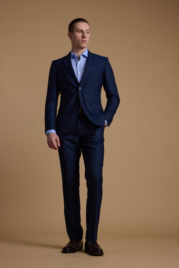 The Wilkin Suit is tailored from 100% Merino Wool Super 100’s, offering a refined balance of quality and comfort. Presented in a versatile blue with subtle texture, it’s designed to stand the test of time. The single-breasted jacket features side vents for ease of movement, cutaway flap pockets, a notched lapel, and a lightly structured shoulder. Fully lined for a smooth fit, it’s best worn with the matching trousers and an Oxford shirt for a polished, weekday uniform that carries you seamlessly from desk to dinner.